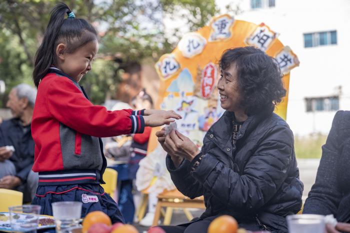 10月29日重阳节,在云南省大理白族自治州洱源县,洱源县第一幼儿园的小朋友为长辈送上重阳糕。新华社发(罗新才摄)