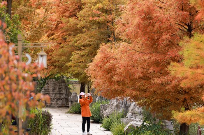 11月6日,游客在云南省曲靖市沾益区西河公园赏景拍照。新华社发(孙文来摄)