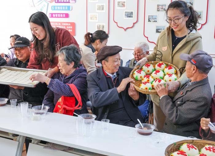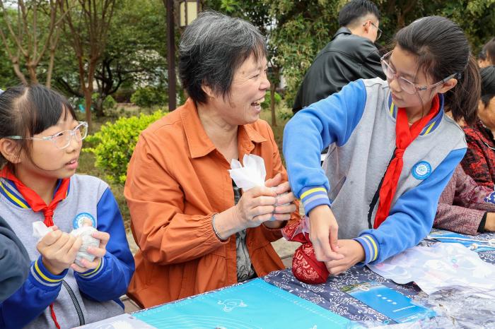 10月28日,在浙江省湖州市德清县新安镇舍北村,老人和学生一起制作茱萸香囊,迎接重阳节。新华社发(姚海翔摄)