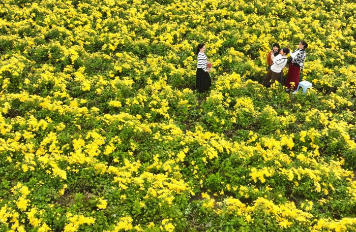 10月25日,人们在山东省邹平市长山镇一菊花园里赏花拍照(无人机照片)。新华社发(董乃德摄)