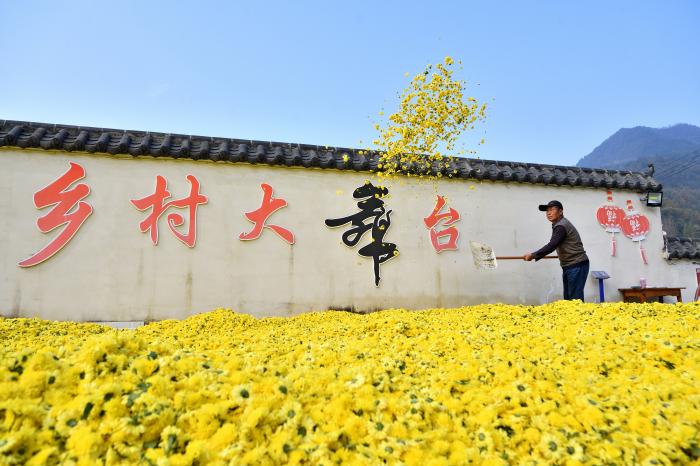 11月3日,在湖北省襄阳市保康县黄堡镇黄堡村菊花种植基地,村民在翻晒菊花。新华社发(杨韬摄)