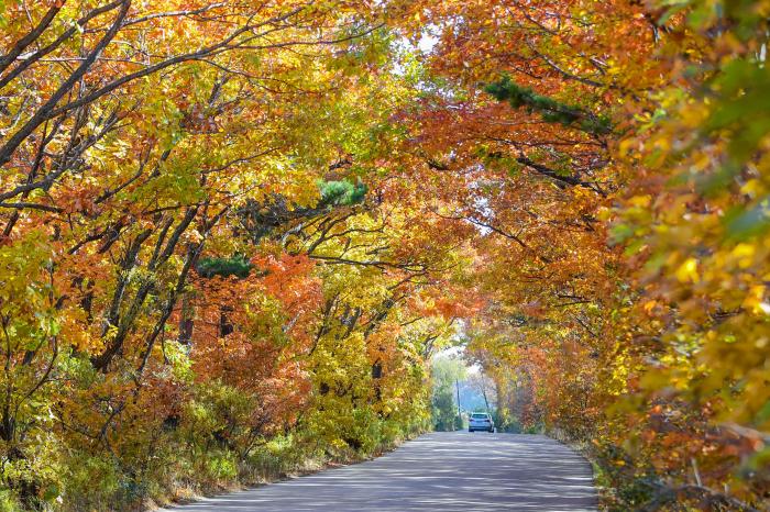 10月24日,在黑龙江省密山市的兴凯湖湖岗上,一辆汽车从色彩斑斓的林荫道中驶过。新华社发(黄永兴摄)