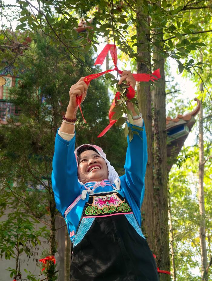 10月29日重阳节,广西南丹县群众按照传统习俗在树木上悬挂福寿带。新华社发(高东风摄)