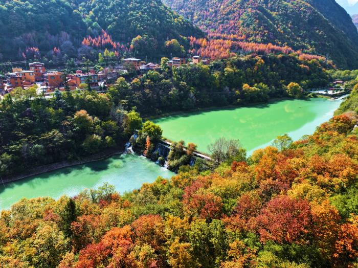 11月2日在甘肃省陇南市宕昌县官鹅沟景区拍摄的秋景(无人机照片)。新华社发(刘辉摄)