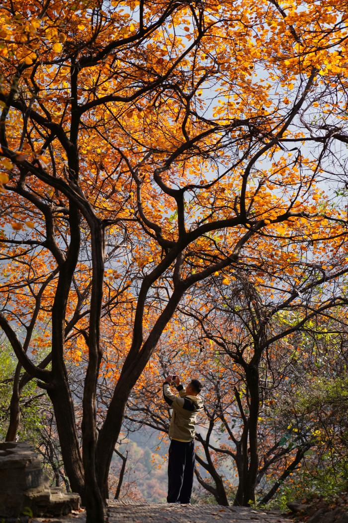 11月2日,游客在河南省沁阳市神农山景区赏景拍照。新华社发(张新雨摄)