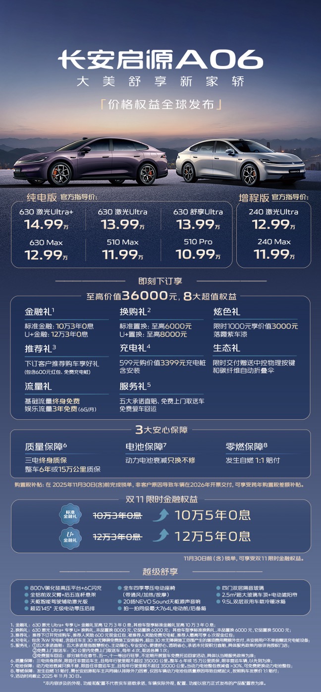 为回馈用户支持,长安启源还推出多重购车礼遇,下订即可享受8大超值权益,至高价值36000元。双11活动之际,长安启源还特别针对11月30日前锁单的用户,升级了限时金融权益,购车可享10万5年0息;其中630激光Ultra+车型更可享12万5年0息!