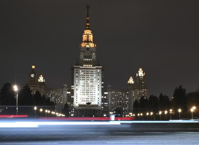 这是11月10日在俄罗斯首都莫斯科拍摄的莫斯科大学主楼夜景。新华社记者 郝建伟 摄
