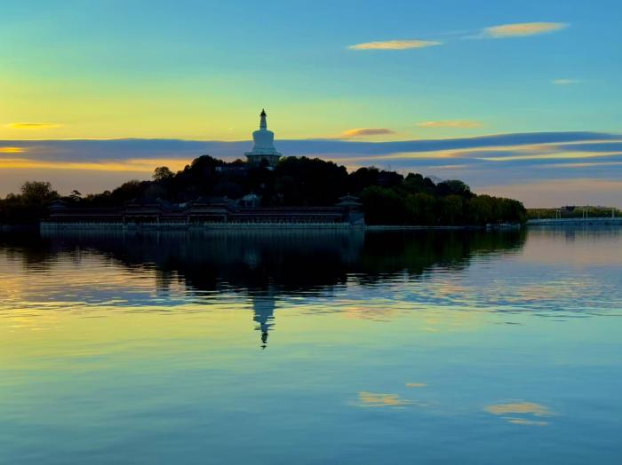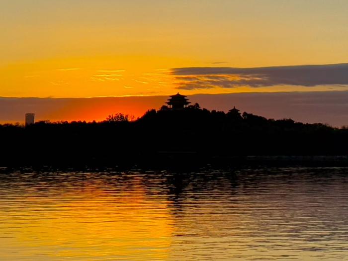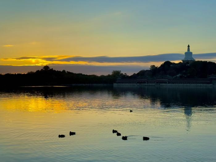 11月18日清晨,北京天空绽放绚烂朝霞,从橙金到绯红的渐变色铺满天际,与故宫、北海公园等地标建筑同框,吸引数百市民清晨赴现场拍摄。
