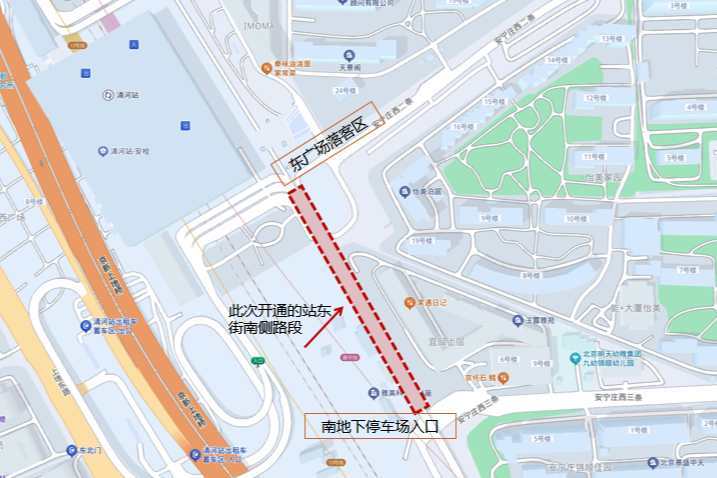 据介绍,此前市民旅客到达清河站东广场落客区仅能通过安宁庄西二条通行,前往南地下停车场则需从安宁庄西三条驶入,两处地点缺乏直接连接通道。此次开通的站东街南段全长315米,作为服务清河站地区的关键城市次干道,直接打通了东广场落客区与南地下停车场的交通断点。对于南向自驾抵离清河站的市民旅客而言,选择从安宁庄西三条驶入,经站东街直达东广场落客区,行驶直线距离可缩短约500米,出行更加省时。
