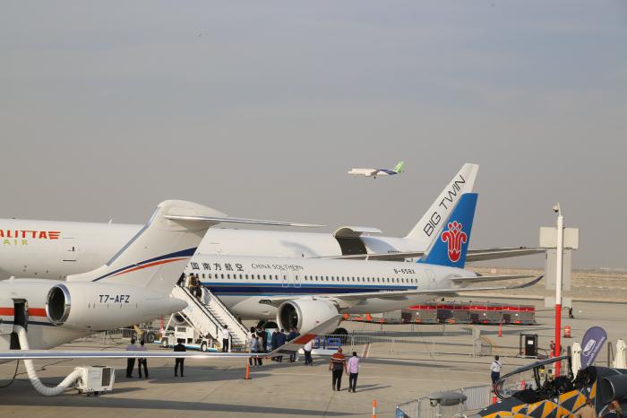11月17日,在阿联酋迪拜,中国商飞的C919飞机进行飞行展示,地面上停着的是中国南航的C919飞机。