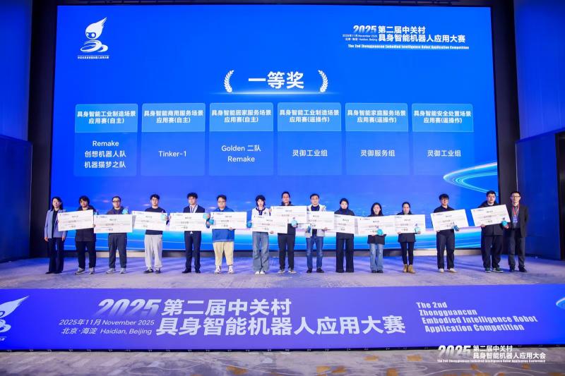 11月19日,2025年第二届中关村具身智能机器人应用大赛收官,54支参赛队在“模型能力、场景应用、学术产业生态”三大赛道斩获奖项,灵御智能、灵心巧手、因时机器人等企业与高校获得各赛项任务第一名。