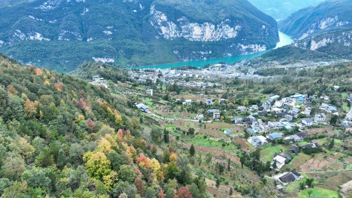重庆市酉阳土家族苗族自治县龚滩镇层林尽染(11月18日摄,无人机照片)。新华社发(邱洪斌摄)