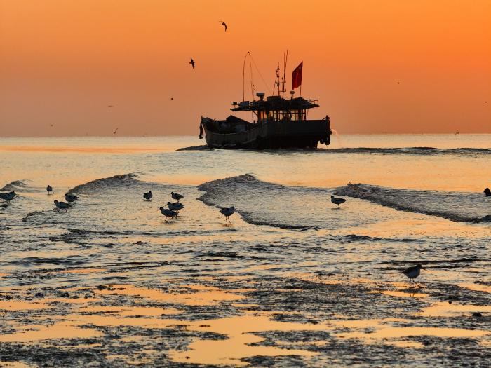 11月19日,海鸟在江苏省连云港市赣榆区沿海湿地里觅食(无人机照片)。新华社发(司伟摄)
