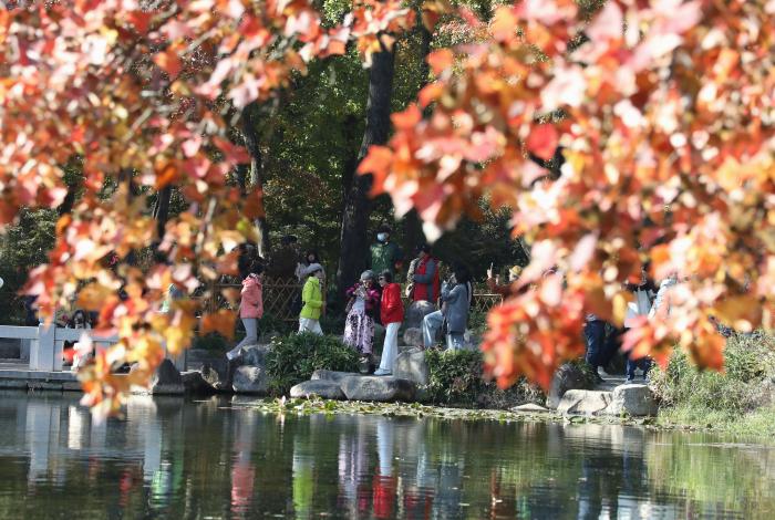 11月19日,游客在江苏苏州天平山景区赏枫游玩。新华社发(杭兴微 摄)