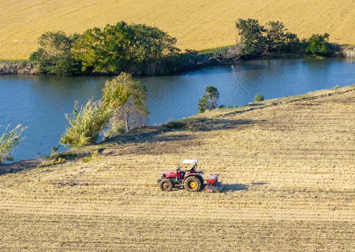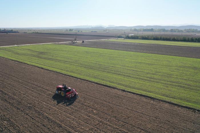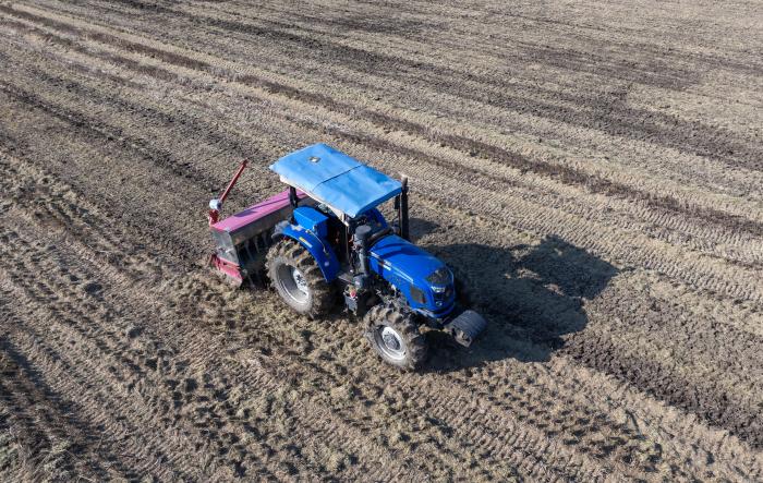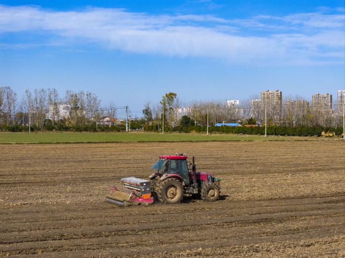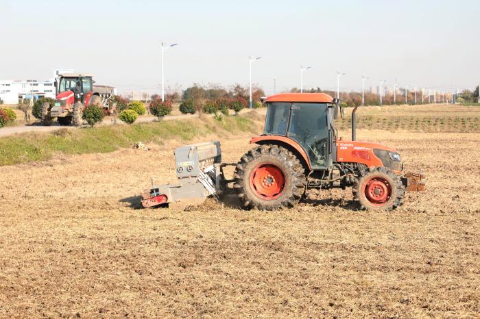 11月19日,在江苏省常州市金坛区金城镇,农机在田里播种小麦。新华社发(陈暐摄)