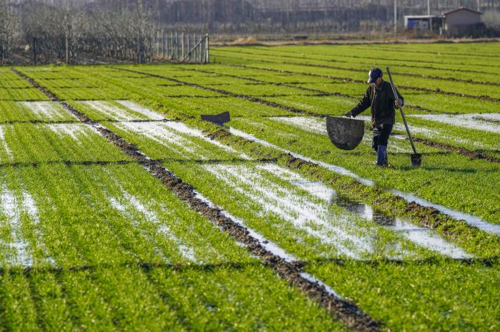 11月19日,河北省遵化市团瓢庄镇农民给冬小麦浇水。新华社发(刘满仓摄)