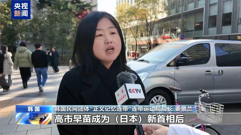 韩国民间团体“正义记忆连带”连带运动局局长 姜景兰:高市早苗成为日本新首相后,意图修改禁止战争的和平宪法第九条。因此,希望李在明政府不要只强调面向未来的韩日合作,而应正视过去,在解决这一问题方面发挥作用。