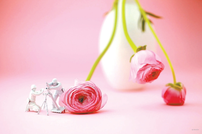 在进入第一部分的展厅后,观众所能看到的第一个作品系列题为《浪漫士兵》。这一系列的图像充斥着鲜亮甜蜜的糖果色,画面的主题为各种常见的、象征着悠闲的食物,乍看之下充斥着安逸、温馨的氛围。然而仔细看时,在甜甜圈、糖果、蛋糕之下却是一个个正处于防御和攻击状态下的微缩玩具兵。这些玩具兵被漆成乳白、粉色,原本晦暗、无生机的军服和装备被转变为这些甜蜜事物中的一部分,化作了“童真”“趣味”的象征。这些作品压制了战争的恐怖感,甚至让人感到梦幻,仿佛置身于一个安逸温馨的房间中。