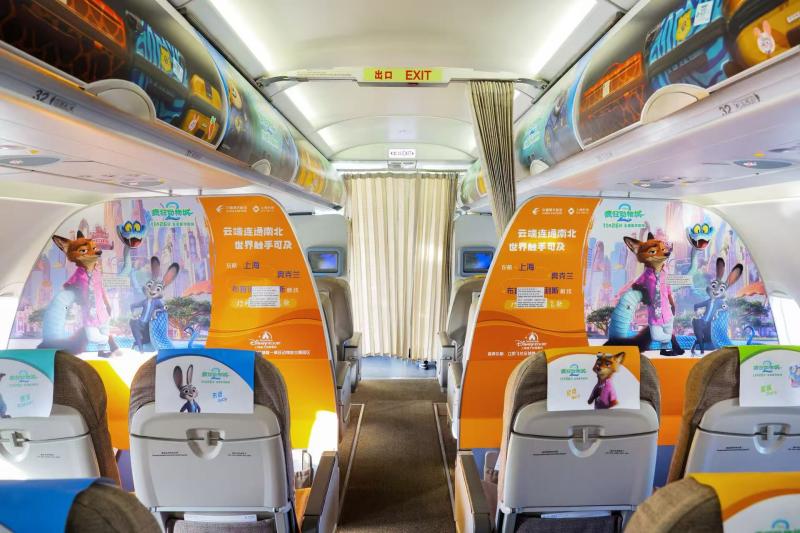 东航与上海迪士尼度假区于2024年5月合作推出的“迪士尼•疯狂动物城号”主题彩绘机完成客舱内饰的焕新升级——新电影中动物城的街景以及朱迪、尼克等经典角色将出现在行李架、小桌板与头枕巾等客舱细节中。在航班飞行途中,机上乘务员会佩戴“疯狂动物城”主题饰品,在互动环节为旅客送上多种周边礼品。