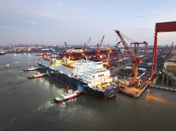 11月20日,17.5万立方米LNG运输船“鑫福124”轮出坞(无人机照片)。新华社发(汤德宏摄)