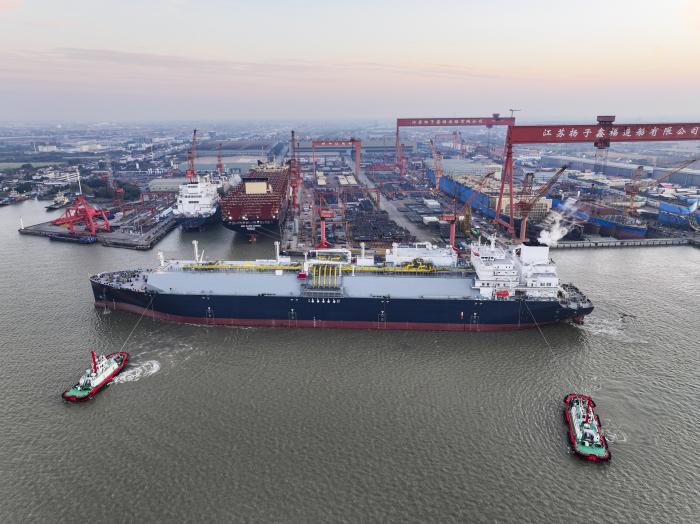 11月20日,在拖轮的牵引下,17.5万立方米LNG运输船“鑫福124”轮驶离江苏扬子鑫福造船有限公司码头(无人机照片)。新华社发(顾继红摄)