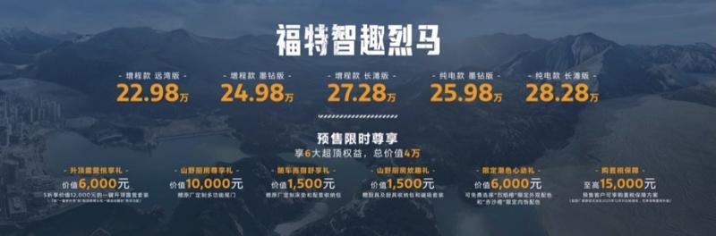 在本届广州车展上,全球首款“全地形露营SUV”——福特智趣烈马启动预售,预售价分别为22.98万元、24.98万元与27.28万元,CLTC综合续航里程达1220公里;纯电版包含墨钻与长滩两款配置,预售价分别为25.98万元与28.28万元,续航里程达650公里。预售期间,用户可尊享总价值高达4万元的6大预售权益。