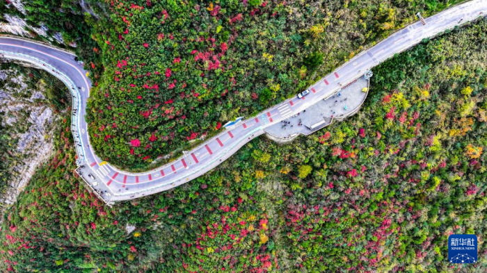 11月22日,游客在重庆巫山神女景区游览(无人机照片)。冬日时节,位于重庆市巫山县境内的长江巫峡一带被渐次变红的红叶点缀,呈现出如诗如画的美景。巫山县拥有120万亩、近200种红叶,红叶观赏期从11月延续至次年1月。新华社记者王全超摄
