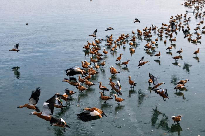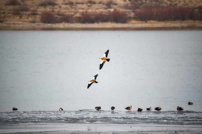 11月22日,在河西走廊东端的甘肃民勤石羊河国家湿地公园,一群赤麻鸭在红崖山水库嬉戏觅食。新华社记者 张智敏 摄