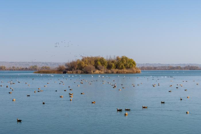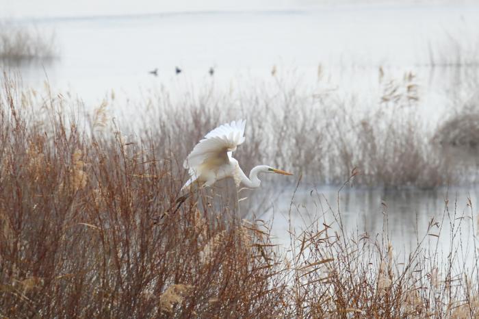 河西走廊地处甘肃省西北部,东西长约1000公里,南北最宽处近200公里,最狭窄处仅数公里。得益于祁连山冰雪融水的滋养,这条狭长走廊中形成了片片绿洲。区域内河流、湖泊、湿地与人工库塘星罗棋布,为候鸟提供了良好的栖息环境和丰富的食物资源,使这里成为我国西北候鸟迁徙路线上不可或缺的“生态驿站”。11月22日,在河西走廊东端的甘肃民勤石羊河国家湿地公园,大白鹭在红崖山水库飞翔。新华社记者 张智敏 摄