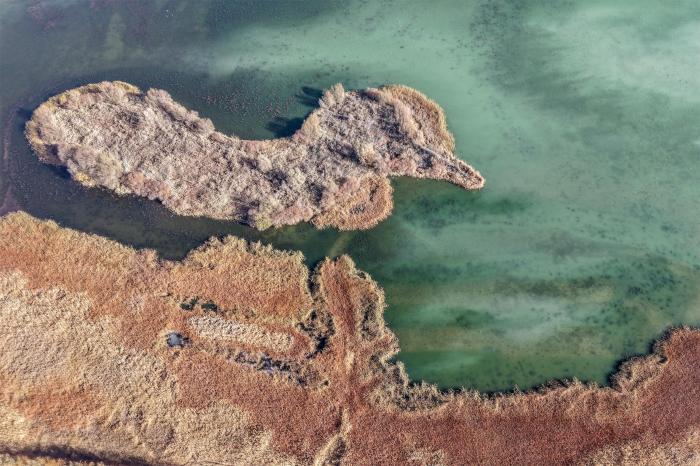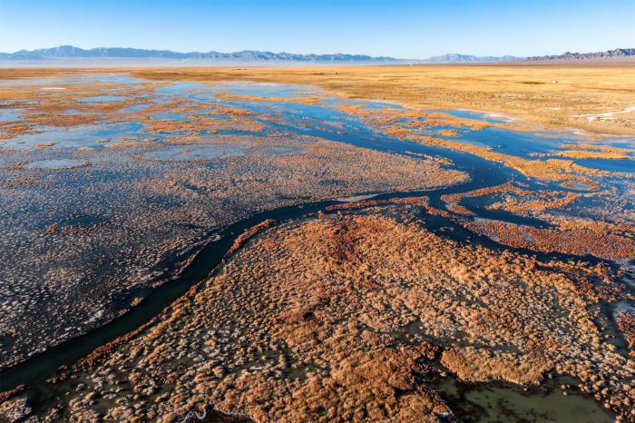 这是11月14日在河西走廊西端的甘肃省阿克塞县小苏干湖湿地拍摄的一片水域(无人机照片)。新华社记者 郎兵兵 摄