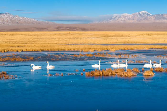 11月14日,在河西走廊西端的甘肃省阿克塞县小苏干湖湿地,大天鹅在一处水域游弋觅食(无人机照片)。新华社记者 郎兵兵 摄