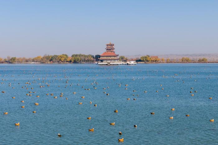 11月12日,在河西走廊中部的张掖黑河湿地国家级自然保护区高台段,候鸟在一处湖泊游弋觅食(无人机照片)。新华社记者 郎兵兵 摄