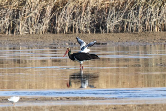 11月12日,在河西走廊中部的张掖黑河湿地国家级自然保护区高台段,国家一级保护野生动物黑鹳在一处湿地浅滩觅食。新华社记者 郎兵兵 摄