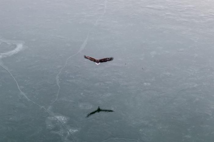 11月22日,在河西走廊东端的甘肃民勤石羊河国家湿地公园,国家一级保护野生动物白尾海雕在红崖山水库翱翔(无人机照片)。新华社记者 郎兵兵 摄