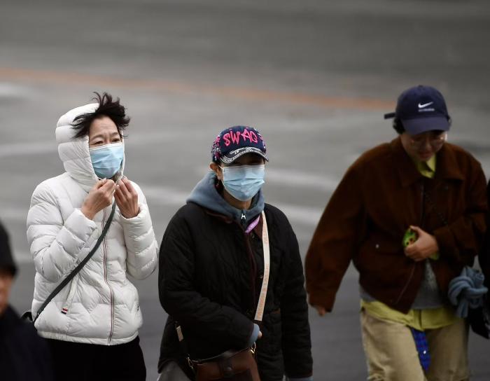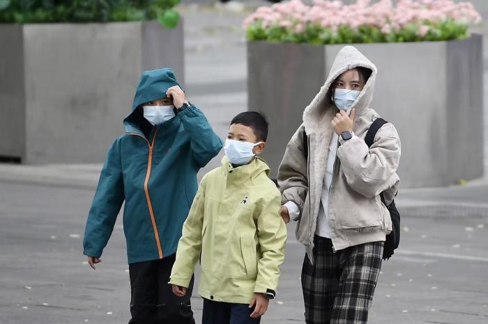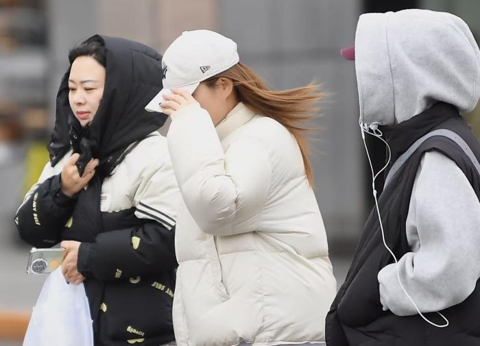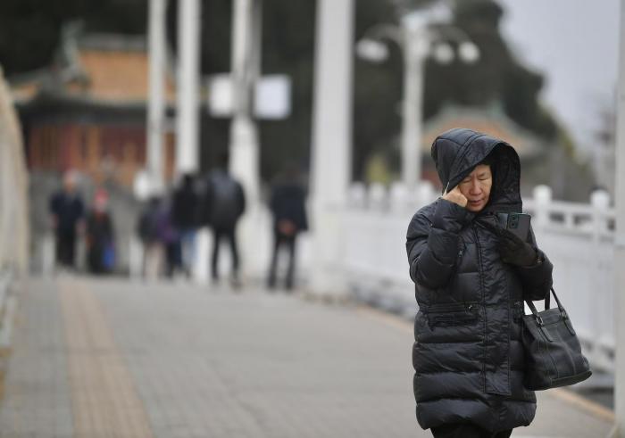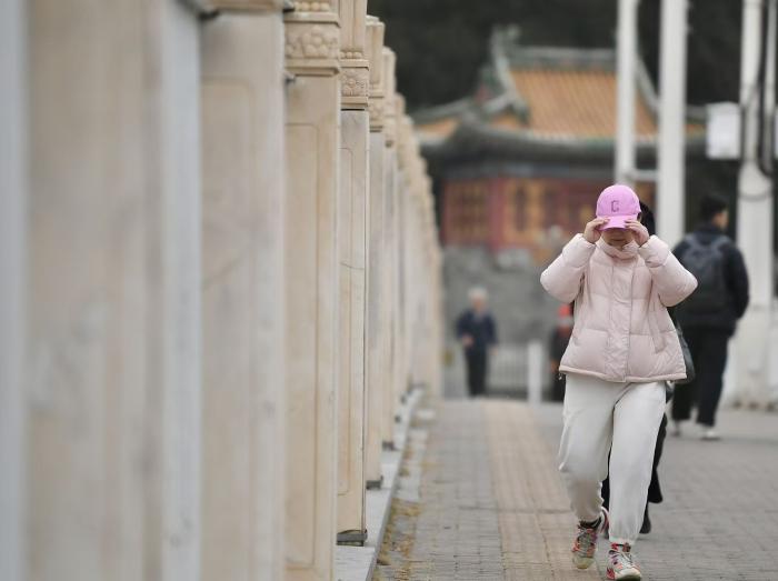 在北海公园旁的步道上,行人拉低帽檐防风。
