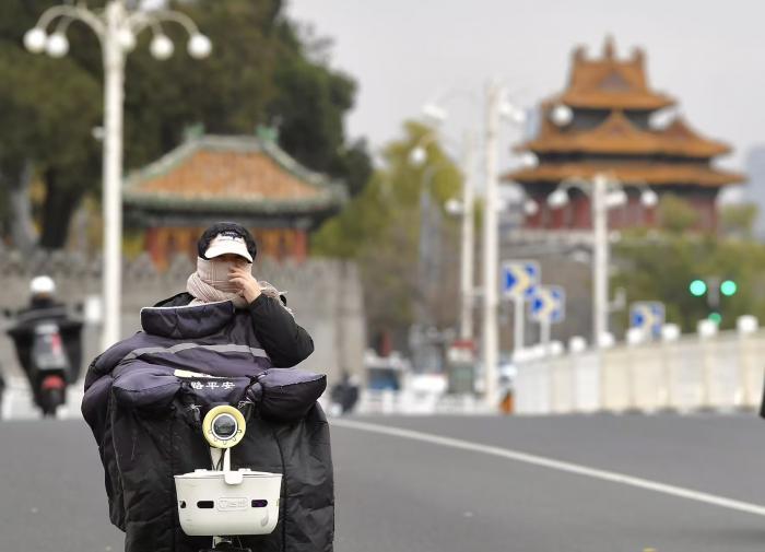 北海公园旁的步道上,骑行者将电动车“挡风被”裹至脖颈。