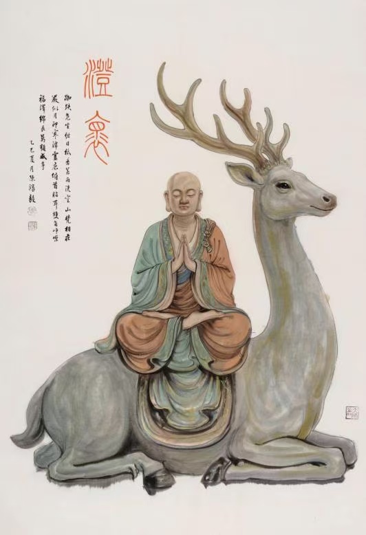 陈鸿毅生于山东东营,黄河入海的磅礴气象赋予他艺术创作独特的灵感。“容纳”与“新生”的地理意象,成为其艺术生涯的隐秘原型。在人物创作上,他笔下的佛道人物,尤其是罗汉系列,绝非梵刹中不食烟火的圣像,而是承载了人间温度与生命哲思的化身。他深得中国人物画的遗蕴,更将其源于油画的强大造型能力熔铸一炉。当代水墨系列呈现出强烈的“水墨雕塑”感,人物结构精准、体感浑厚,是中国传统写意精神与西方现代立体主义视觉经验的成功对话。当代彩墨系列更是结合多样的色彩形成独一无二的艺术面貌,极具当代感。其山水作品在重构古典意境的同时,融入当代形式探索,以“鸿毅橙”为画面主导色彩,重塑青绿山水视觉传统,营造出苍茫厚重又辉煌宽博的艺术世界。花鸟作品则分两路,工细精研之作承宋人格物精神,水墨氤氲之笔畅神写意,尽显灵动之趣。