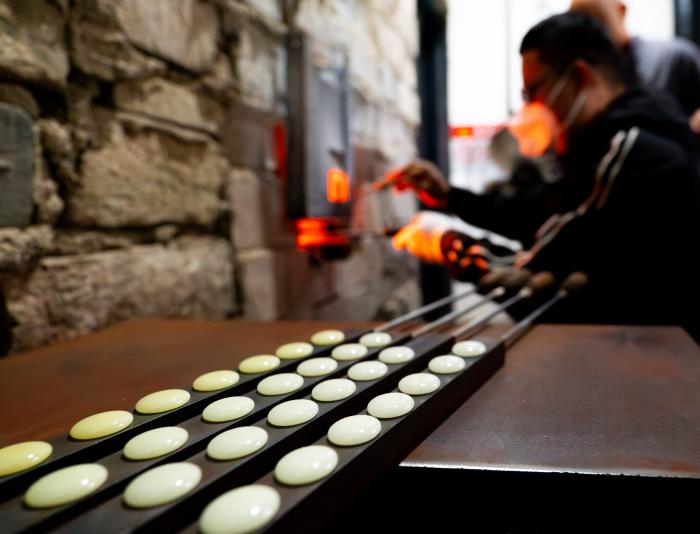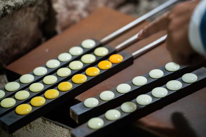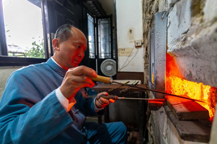 走进位于保山市隆阳区金鸡乡的永子文化园,上千度的窑炉昼夜不息。永子第十二代传人、国家级非遗传承人李国伟坐于炉前,目光如炬。他右手持特制滴棒,从容蘸裹熔化的玉料,将其轻巧滴沥在左手所持的厚铁板上。在一点一收间,一枚枚莹润细腻的永子从火红的液态逐渐凝固成扁圆的固态,在铁板上整齐排列。11月20日,李国伟在保山市永子棋院查看永子成色。
