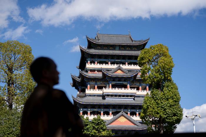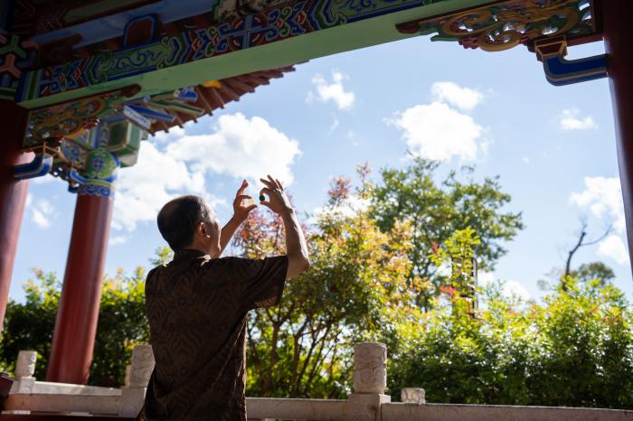 11月20日,李国伟在保山市永子棋院永昌阁前远眺。
