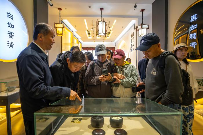 自小与永子相伴,李国伟从中悟出的远不止制作技艺。“永子只有黑白两色,却包罗万象;棋盘纵横十九道,却变化无穷,”他说,“永子从来不是拘泥于方寸之间的棋子。”在他眼中,棋如人生:玉石经熔炼而重生,心智在对弈中淬炼。1997年,20岁的李国伟师承伯父李学堂,开始学习制作永子。光阴荏苒,李国伟已带徒传艺,培养弟子150余人。炉火不熄,薪火相传,这门古老的手艺,有了更多人延续。11月19日,李国伟(左一)在保山市永子棋院内的永子博物馆向游客介绍一副古代永子。