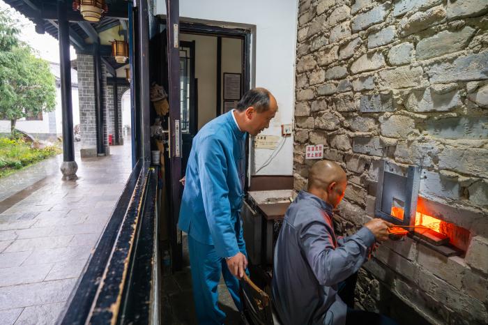 夕阳西下,永昌阁的飞檐翘角倒映在青华海平静的碧波中。李国伟凭栏远望,看苍山如黛,湖水浮光。永昌阁内,国内外弈者手执永子对弈,阳光穿过黑子白子,在指尖投下温润的光影。光影中沉淀着的是永子穿越几百年的一滴一凝,也是匠人对智慧与美的不懈追求。11月19日,在保山市永子文化园,李国伟(左)指导徒弟张佳林滴制永子。