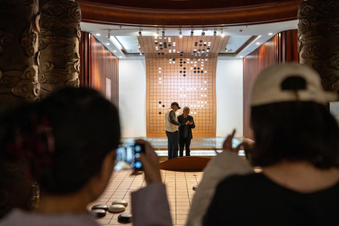 11月20日,游客在保山市永子棋院内的永子博物馆拍摄围棋艺术装置。