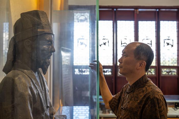 11月20日,在保山市永子棋院,李国伟注视李德章雕像。