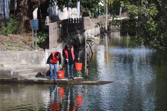 11月25日,和平镇长城村党员志愿者在河岸旁清理漂浮物。