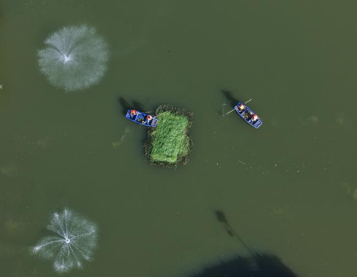11月25日,和平镇长城村保洁人员乘船打捞水面漂浮物(无人机照片)。