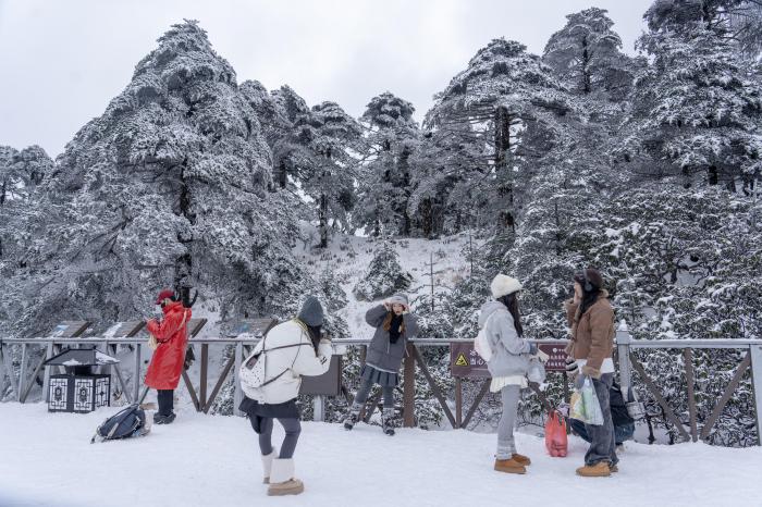 11月24日,游客在云南大理苍山景区雪景中拍照留念。