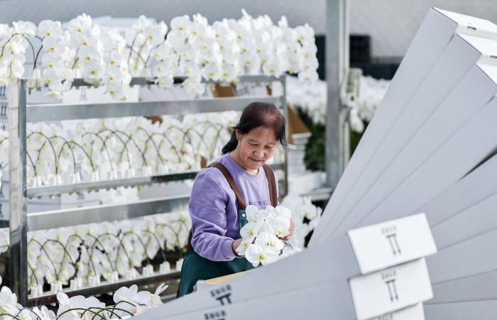 目前,兴庆区花卉种植面积7000余亩,带动4000余名农户就业,形成鲜切花、盆栽、绿化观赏苗木三大品种产业链,花卉产业年产值约1.6亿元。11月25日,在位于宁夏银川市兴庆区大新镇的农业高科技智慧示范园内,工人包装鲜切蝴蝶兰。
