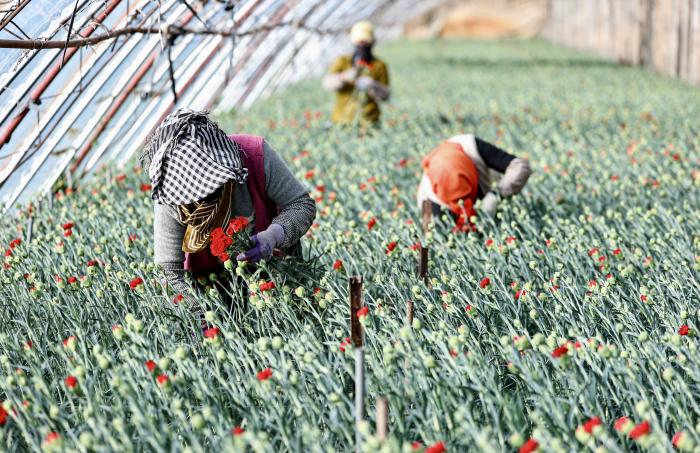 近年来,银川市兴庆区依托光照资源优势,发展特色花卉产业,通过建成农业高科技智慧示范园,提升花卉冬季生产能力。11月25日,在位于宁夏银川市兴庆区大新镇的农业高科技智慧示范园内,工人在采摘康乃馨。