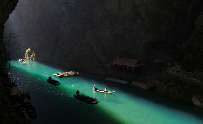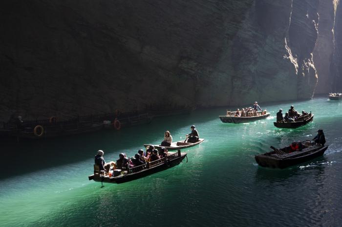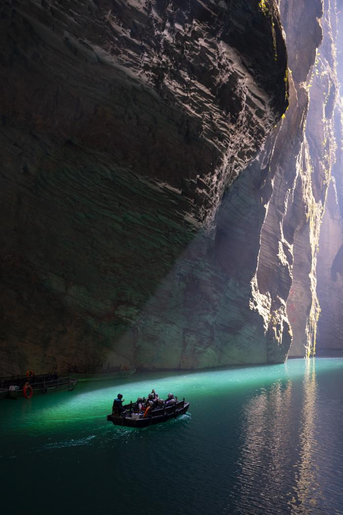 正午时分,阳光穿过幽深峡谷,将蜿蜒的“一线天”照亮,舟行水上若悬浮于空中,形成了独特的“舟浮空中”奇观。11月24日,游客在湖北省恩施土家族苗族自治州鹤峰县屏山峡谷坐船游玩。
