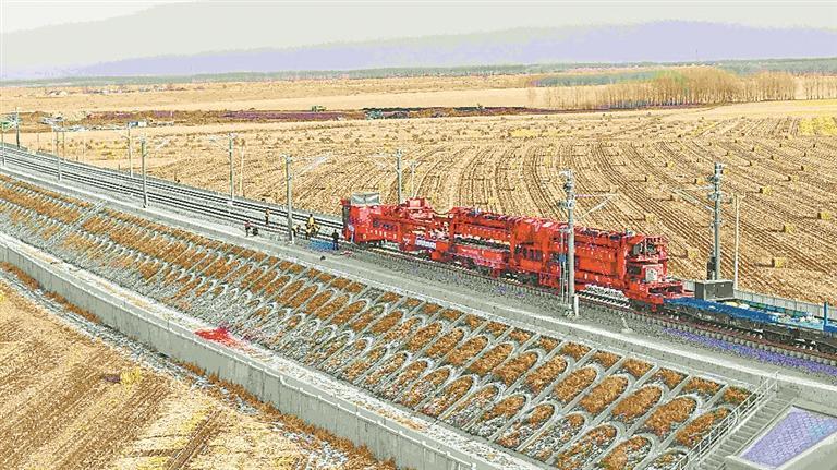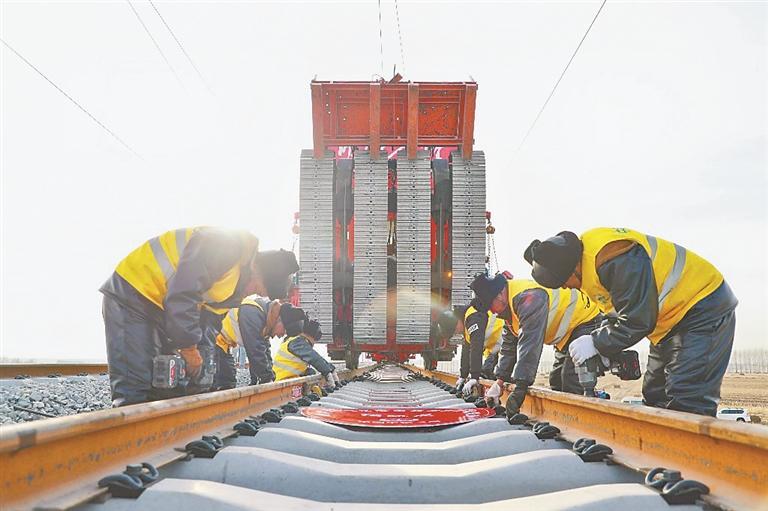 哈伊高铁于2024年5月28日正式启动铺轨。为确保施工进度和质量,中国铁路哈尔滨局集团有限公司结合当地全年气候特征,组织施工单位加大物资、机械设备投入力度,克服高寒地区气温低、施工工期短等难题。中铁二局集团公司采用国内先进的群枕法铺设工艺,日均铺轨进度达2.5公里,较传统铺轨方式提高工效50%。同时,广泛应用信息化、智能化管理手段,通过智能工程线调度信息平台,实现对铺轨机组、长轨运输列车等关键设备的远程实时监测,保证了各单位施工运行安全。